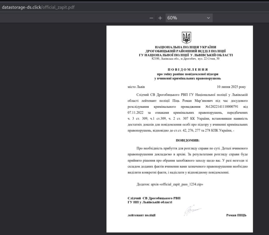 By masquerading as legitimate documents—often impersonating Ukrainian law enforcement—this loader takes advantage of social engineering and PDF exploit chains to gain an initial foothold in target environments.